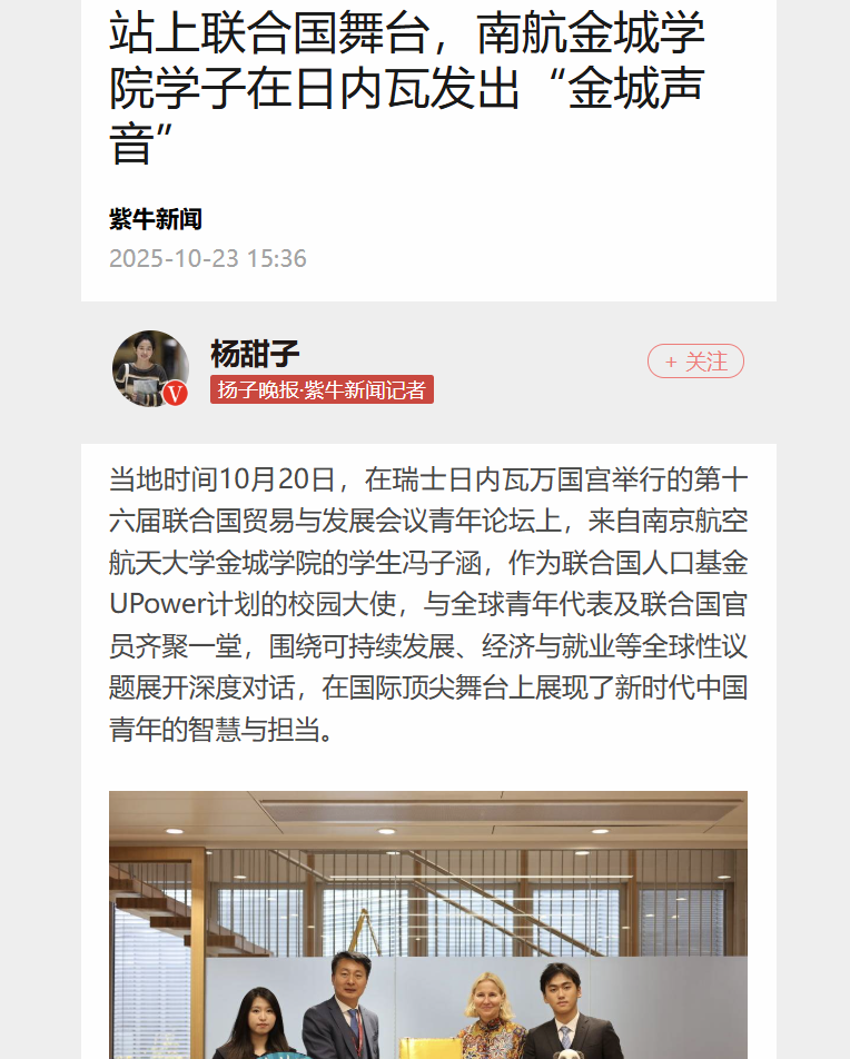 【扬子晚报】站上联合国舞台,南航金城学院学子在日内瓦发出“金城声音”