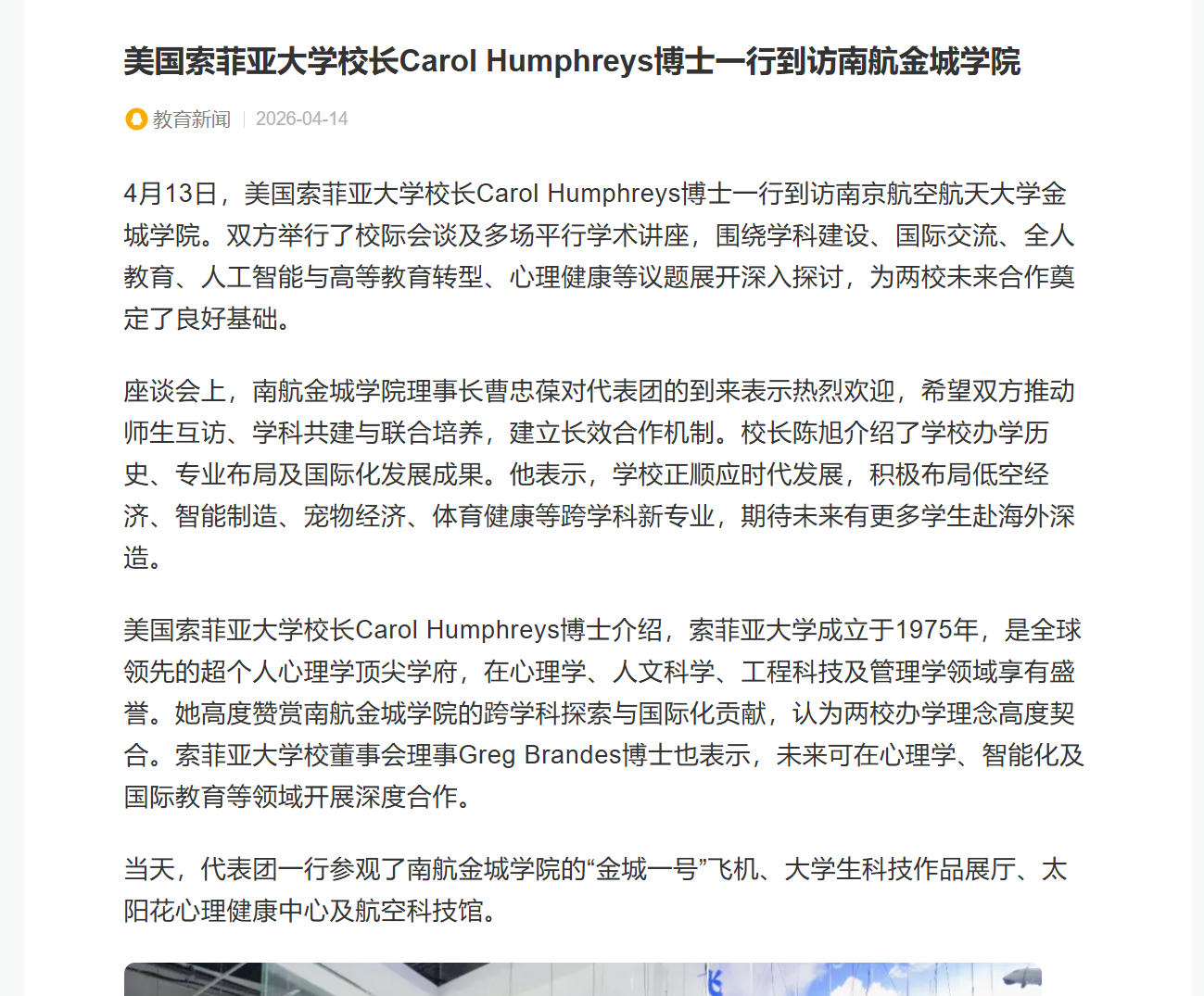 【腾讯新闻】美国索菲亚大学校长Carol Humphreys博士一行到访南航金城学院