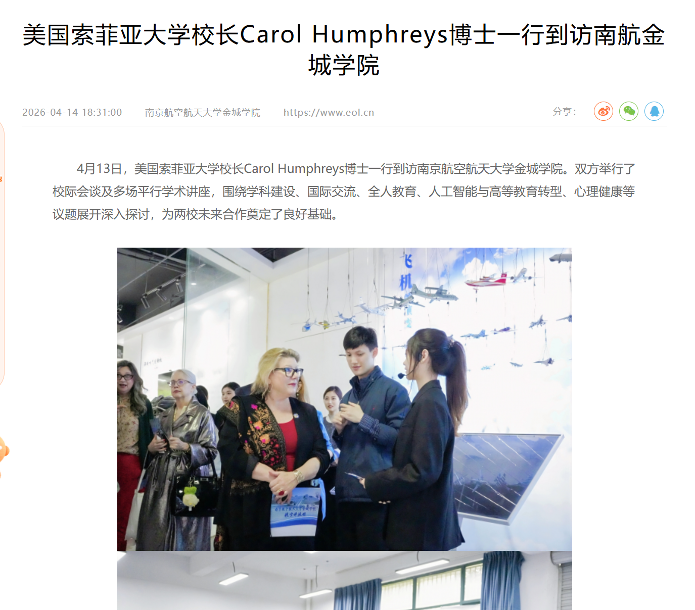 【中国教育在线】美国索菲亚大学校长Carol Humphreys博士一行到访南航金城学院