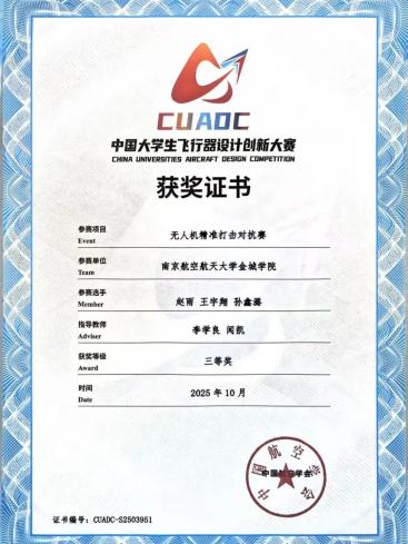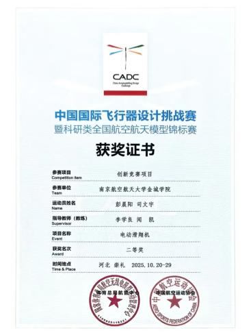2025年,南航金城学院(新E代数智未来产业学院)腾云航模队分别挑战飞行器设计类比赛两项重要赛事,分别是一阶段10月上旬在浙江德清举办的中国大学生飞行器设计创新大赛总决赛(简称CUADC)和二阶段10月下旬在河北崇礼举行中国国际飞行器设计挑战赛总决赛暨科研类全国航空航天模型锦标赛(简称CADC),获得国家级二等奖2项,三等奖2项,区域赛一等奖(第一名)1项,取得佳绩。