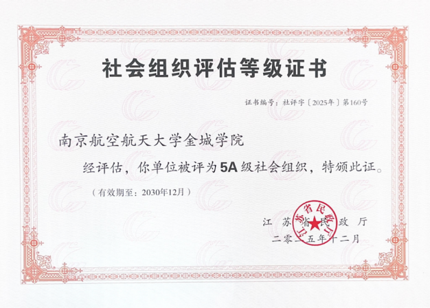 3月6日,江苏省民政厅颁发的“江苏省5A级社会组织”证书与奖牌正式送达南京航空航天大学金城学院。这一荣誉标志着我校办学综合实力达到省级认定的领先水平。