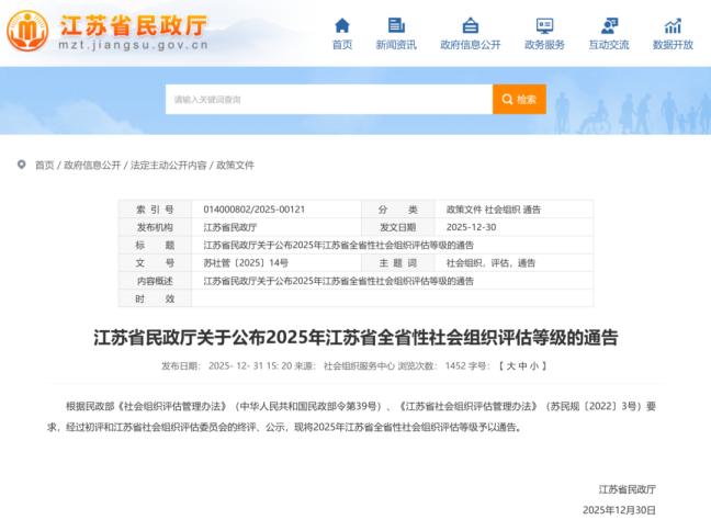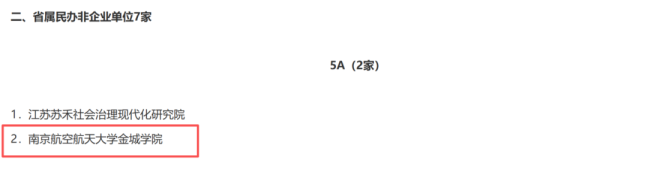2025年,江苏省共有284家全省性社会组织申报等级评估。经过资格审核、专家评估、实地考察、江苏省社会组织评估委员会终审及社会公示,最终75家单位获评5A级社会组织。其中,仅2家省属民办非企业单位获评5A级,南京航空航天大学金城学院荣列其中。